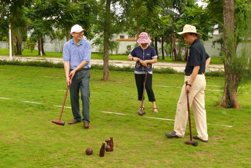 木球是海大的特色运动项目,已有十几年的发展历程,公司木球队在历年国内、国际赛事中,一直保持国内领先水平。今年7月公司木球队在山东举行的两个全国木球赛中取得了院校组男、女团体第一名和4项个人第一名,受到国家体育总局的商请,即将于今年12月代表国家赴阿曼马斯喀特参加第二届亚洲沙滩运动会。8月29日上午,公司党委刘康德书记和傅国华副董事长亲临公司“金桥”木球场现场,为即将代表国家出征的海大木球队加油、鼓劲,并与木球队员一起体验木球运动。